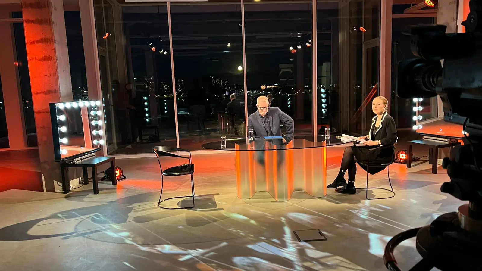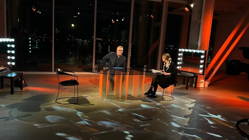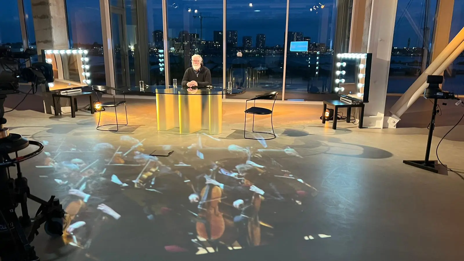 Projectie op de vloer als decor tijdens de opnamen van het programma INSIDERS.